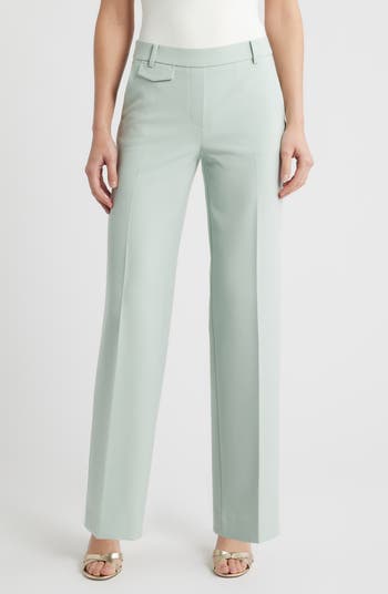 Belt loops and a front flap pocket argue for tucked-in styling for these pull-on pants cut in a high-waist, wide-leg silhouette.