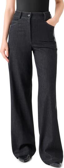 Cut in a wide-leg silhouette, these black-wash jeans are crafted from stretch-enriched denim with a high rise and glittery side stripes that further elongate the look. A dot appliqué at the back pocket adds a signature flourish.