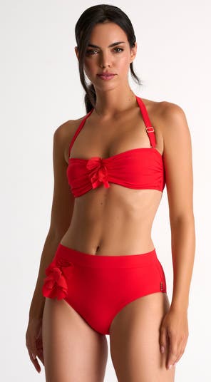 High-waisted bikini bottom with a band, adorned with petal mesh details. Provides full coverage and an elegant style.