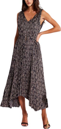Pleated dress with an asymmetrical hem and a self belt with a gold buckle.