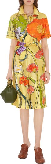 A short-sleeved shirt dress in silk twill, created in partnership with Highgrove Gardens, which surround the private residence of Their Majesties King Charles III and Queen Camilla. Featuring hand-drawn artwork by the British artist Helen Bullock, the print depicts the tangled sway of poppies, cosmos and sweet peas found in the Kitchen Garden at Highgrove. Tailored to a slim fit with a belt to adjust the silhouette.||Side zip closure|Point collar|Button placket|Self-tie belt|Side slip pockets|Printed Burberry lettering at front and back|The Highgrove mark is used under licence from A G Carrick Limited