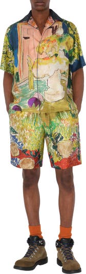 A short-sleeved silk shirt created in partnership with Highgrove Gardens, which surround the private residence of Their Majesties King Charles III and Queen Camilla. Featuring hand-drawn artwork by British artist Helen Bullock, the print captures the focal point of Highgrove’s Kitchen Garden – an enchanting Italian fountain covered in moss. The style is trimmed with blue piping and tailored to a relaxed fit.||Button closure|Revere collar|Straight hem|Printed Burberry lettering at front and back|The Highgrove mark is used under licence from A G Carrick Limited