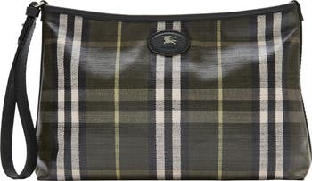 Rooted in the outdoors, the Highlands pouch is made in Italy from a cotton linen blend trimmed with smooth calf leather. The fabric is jacquard-woven with the Burberry Check and has a coated finish inspired by rainwear. The compact design is detailed with a wrist strap and our Knight stamp – an archival motif first seen on Burberry bags in the 1980s.||Leather wrist strap|Zip closure|Hand-painted edges|Brushed metal hardware|Leather patch with Equestrian Knight Design at front|Unlined|Comes with a dust bag