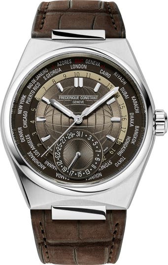 An etched globe centers the international jet-setter's dream dial on this automatic watch labeled with names of cities representing each of the 24 time zones. Know the precise time anywhere in the world from anywhere in the world thanks to the ingenious design and the Swiss-made FC-718 automatic movement.