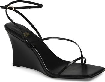 A squared-off toe and asymmetric strap bring sharp angles and dimension to a faux-leather sandal lofted by a wrapped wedge heel.