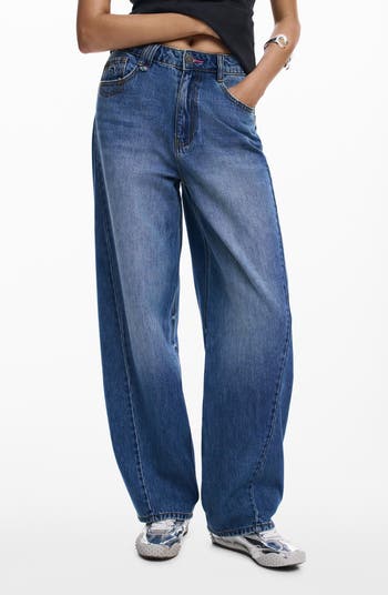 Update your denim game with these nonstretch jeans styled with structured barrel legs and asymmetric seams.