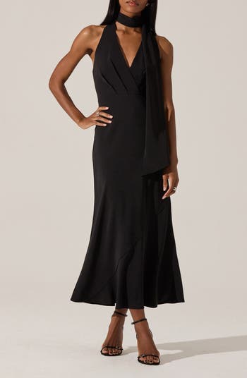 Bring on the night in a halter-neck dress that dials up the drama with a flourishing scarf detail.