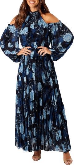 Bold blooms bring sweet energy to this maxi dress framed by long sleeves with cutouts at the shoulders and pleats falling from the neck for perfect drape.