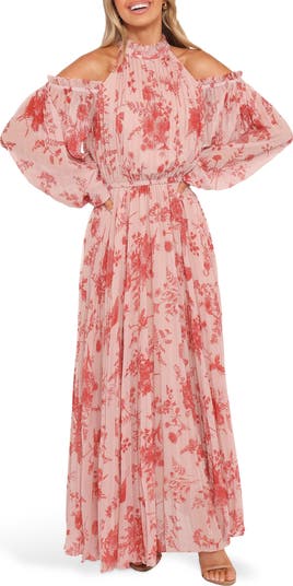 Soft pleats add texture and graceful movement to this flowy shoulder-baring maxi framed by billowed sleeves and fanciful frills.