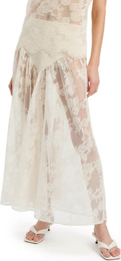 Semisheer floral lace brings unmistakable romance to a maxi skirt cut in a flowy silhouette.
