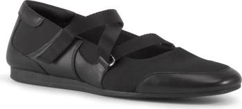 A zigzag webbing strap lends a sporty element to this ballerina flat featuring a mixed-media design of twill and smooth leather.