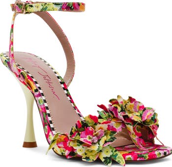 Dimensional floral appliqués make a delightful statement on an ankle-strap sandal complete with a lofty stiletto heel.