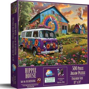 Hippie House 500 Piece Jigsaw Puzzle - 500 pc Jigsaw Puzzle - Completed Size: 18" x 24" - Puzzle Artist: JQ Licensing - Interlocking Pieces and Durable Construction: SunsOut jigsaw puzzles feature interlocking pieces that fit securely, making assembly easier and reducing frustration. Made with high-quality recycled cardboard, they are durable and to easy to work with - Warranty: SunsOut puzzles being made in the USA ensures high manufacturing standards include a worry-free guarantee ensuring any issues with missing or damaged pieces are resolved, reflecting SunsOut's commitment to quality and customer service. - Eco-Friendly Materials: SunsOut puzzles are crafted with eco-friendly materials