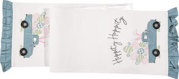 - This 100% cotton table runner features a white ground with an embroidered Easter scene at each end, depicting a blue vintage truck loaded with pastel eggs and bunny ears beside a Hippity Hoppity script, finished with ruffled blue border trim.