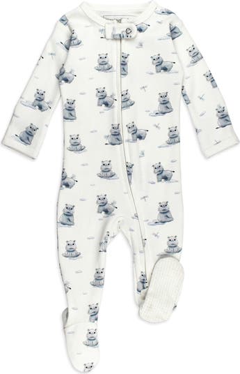 A sweet hippo print covers these organic-cotton footed pajamas designed with fold-over cuffs to protect baby from accidental scratches.