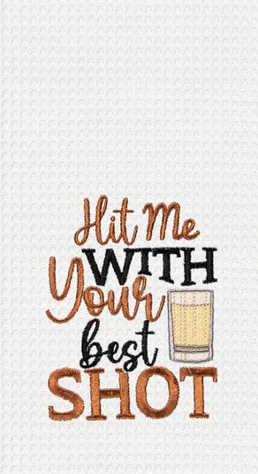 Add a playful touch to your kitchen with this "Hit Me With Your Best Shot" embroidered dishtowel. Perfect for anyone with a love for mixed drinks and a sense of humor, this towel features a witty design that will spark conversations and smiles. Whether you're drying dishes after dinner or simply adding a pop of fun to your kitchen decor, this towel is an excellent choice. The high-quality waffle weave fabric ensures it's not only soft to the touch but also highly absorbent, making it ideal for everyday use. With its versatility, this towel works perfectly throughout the year, adding a lighthearted vibe to summer barbecues, spring brunches, or cozy winter evenings. It also makes a thoughtful and fun gift for friends, family, or anyone who enjoys mixing drinks or entertaining. The towel is machine washable, ensuring it's easy to maintain and perfect for keeping in rotation in your kitchen. Elevate your kitchen decor with this humorous and functional accessory.