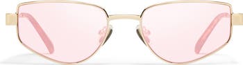 Angular cat-eye frames and logo-accented temples distinguish slender sunglasses featuring adjustable nose pads for a customized fit.