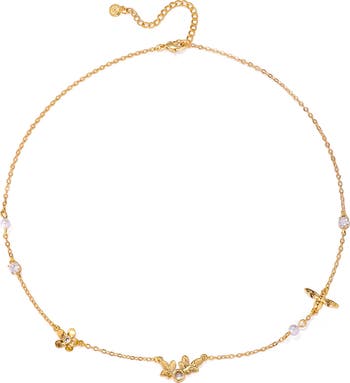 Add a kiss of nature-inspired whimsy to your look with this delicate chain necklace plated in warm 18-karat gold and punctuated with cubic zirconia and a single faux pearl.
