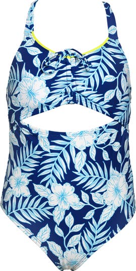 Your kiddo will love soaking up the sun in this ruched one-piece with a tropical print and a cutout in front.