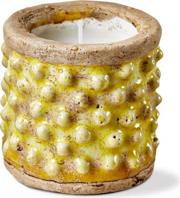 keep summer evenings buzz-free with the hobnail citronella candle in yellow terracotta. hand-poured in a beautiful yellow terracotta pot with a rustic glaze finish, this candle features a blend of citronella wax and paraffin wax for long-lasting mosquito repellency. the cotton wick ensures a clean and even burn.