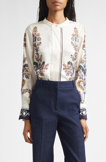 Sharp tailoring meets artful detail in this sophisticated top. A refined floral pattern frames the sleeves and sides, while crisp stripes trace the hidden placket. Finished with a stand collar and balloon sleeves, it brings polished structure with a modern, expressive edge.