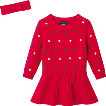 Tactile green and white bubbles bring a festive holiday look to a soft cotton sweater-dress that's fashioned with a rib-knit skirt for a two-piece look.