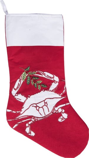 Celebrate a coastal Christmas with our Crab Stocking. This stocking, featuring a playful crab grabbing a leafy twig design on a festive red background, adds a touch of seaside charm to holiday decor. The vibrant colors and detailed applique and embroidery design makes it a standout piece for your festive celebrations.