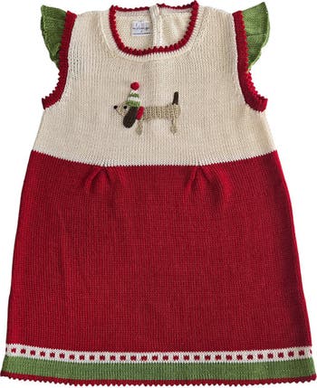 Full of charm and cheer, this hand-knit Christmas dress is perfect for festive celebrations. Featuring a sweet pup in a pom-pom hat and scarf, the cream and red color block design is accented with fluttery green sleeves.