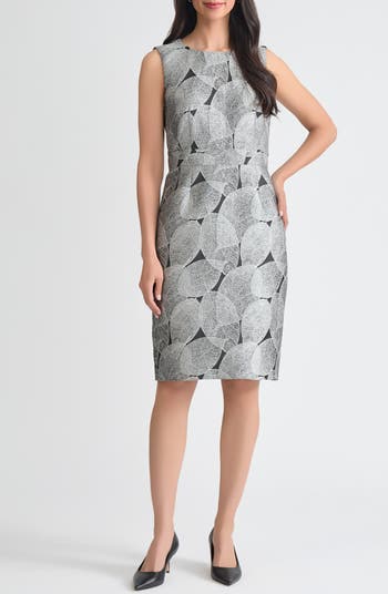 Jacquard leaves drift down this elegant jewel-neck sheath dress that offers perfectly polished style with a defined waistband and subtle back vent.