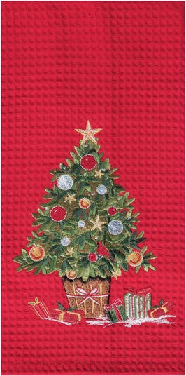 Spread seasonal cheer in the kitchen with this festive Holiday Tree Embroidered Waffle Weave Towel. The bright red background and playful tree adorned with decorations and presents below is sure to make a jolly addition to your home. Deck your dish-towels this winter and never lose the cheerful holiday spirit!