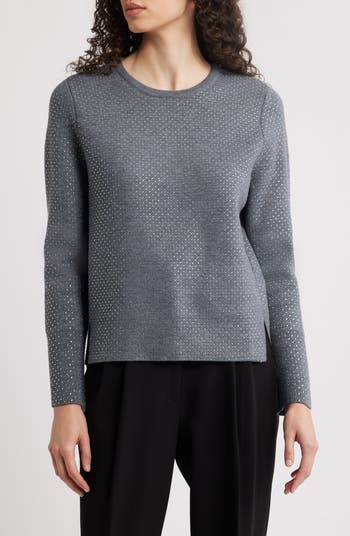 Do your best impression of an enchanting disco ball in this luxuriously soft sweater dotted allover with a field of tiny twinkling rhinestones.