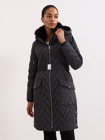 A puffer coat is a winter wardrobe staple, and this jacket is no exception. Designed with a quilted design reminiscent of the classic herringbone pattern, this coat features a detachable hood, elasticated cuffs, adjustable belt and large pockets. It’s the perfect practical yet stylish winter coat.