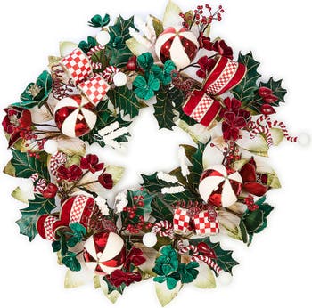 Brighten the holiday season with this festive Christmas wreath highlighted by branches brimming with red and green baubles, ribbon bows featuring the brand's signature red check patterns and faux holly leaves.