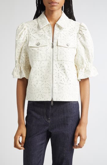 Floral embroidery provides a sophisticated update for this faux-leather jacket complete with elbow-length sleeves.