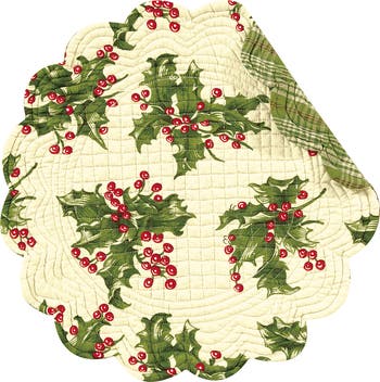 - Add timeless holiday charm to your dining setting with these round quilted placemats featuring a cream background accented by holly leaves and red berries.