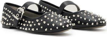 Polished studs add fierce dimension and amplify the bold aesthetic of a streamlined leather ballet flat fastened with an adjustable mary jane strap for a secure fit.
