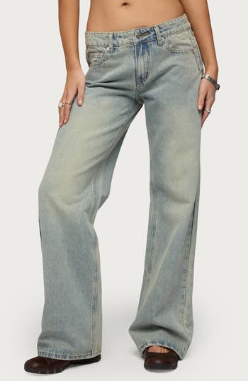 Allover fading enhances the lived-in appeal of these low-slung wide-leg jeans fashioned from nonstretch denim.