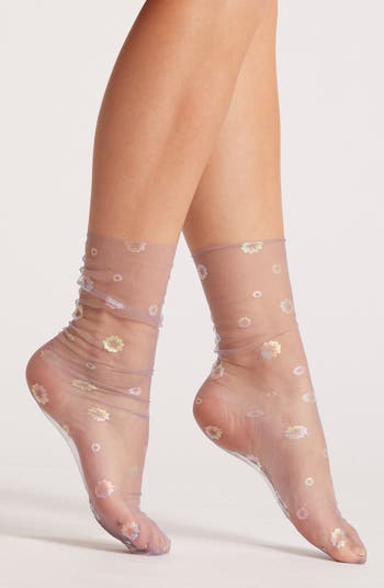 Add a sheer surprise to your outfit with these tulle crew socks brightened with holographic blooms.