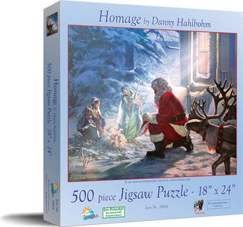 Revel in the holiday magic as you piece together the Homage 500 piece jigsaw puzzle by SunsOut Puzzles. Expertly crafted with stunning artwork by Danny Hahlbohm, this puzzle captures a heartwarming Christmas scene that merges the beauty of nature with the holiday spirit, creating a serene ambience with every piece you place. Elegantly designed with intricately interlocking pieces made from durable recycled cardboard, each piece fits effortlessly, giving you a satisfying puzzling experience. SunsOut Puzzles' eco-friendly commitment shines through their use of recycled materials and soy-based inks, and the puzzle’s manufacturing in the USA ensures excellent quality while supporting a small, woman-owned business. This assurance of quality extends to a worry-free guarantee, ensuring immediate redressal of any concerns about missing or damaged pieces. Ideal as a thoughtful gift, this puzzle offers endless fun and a captivating, immersive experience that culminates in a sense of accomplishment and a cherished addition to any puzzle enthusiasts' collection. Take a break from the hustle and bustle, rediscover the magic of Christmas, and elevate your holiday décor with this beautifully designed puzzle that tells a story within each piece. With SunsOut Puzzles, start your puzzling adventure today!