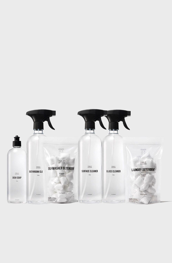 Home cleaners bundle includes surface cleaner, glass cleaner, dish soap, dishwasher detergent pods, laundry detergent pods and bathroom cleaner, formulated with purified water, plant-derived actives, citric acid and essential oils. Made without MIT, ammonia, butyl cellosolve, glycol ether, parabens, synthetic fragrance, sodium lauryl sulfate, phthalates or formaldehyde. Provides a plant-based option for all household cleaning needs.