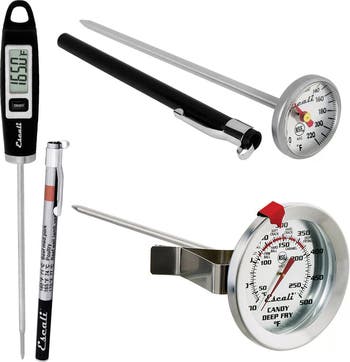 Take the guesswork out of cooking, baking, and candy making by measuring internal temperatures of foods for better results and consistency. The Escali Home Thermometer Bundle consists of three thermometers to cover all of your cooking needs; the DH1 Gourmet Digital Thermometer, the AHC1 Candy and Deep Fry Thermometer, and the AH2 Instant Read Thermometer. The Escali DH1 Gourmet Digital Thermometer is stylish and ergonomically designed. An extra-long probe for extended reach and a comfort grip handle ensures this premium thermometer is ready for prolonged use. The Escali AHC1 Candy and Deep Fry Thermometer will help you cook candy or deep-fried foods to perfection. The easy-to-read dial display features various confectionary cooking temperatures, an adjustable target temperature indicator for easy reference, and is NSF certified. The Escali AH2 Instant Read Thermometer will help you temperature check food to ensure it is cooked properly for safety and consistency. The magnified lens provides enhanced visibility, and the protective probe sheath is imprinted with target cooking temperatures for beef, poultry, pork, lamb and veal for quick reference.