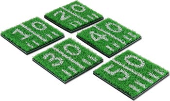 - Quantity: Set of five coasters Material: Real Astro Turf material, Soft backing won't scratch surfaces Dimensions: 4" x 4"