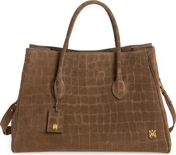 The spring '26 collection reveals new explorations in form and proportion, such as this roomy tote crafted in Italy from croc-embossed suede. It's designed with structural side gussets, top handles and a removable strap for versatile carry options.