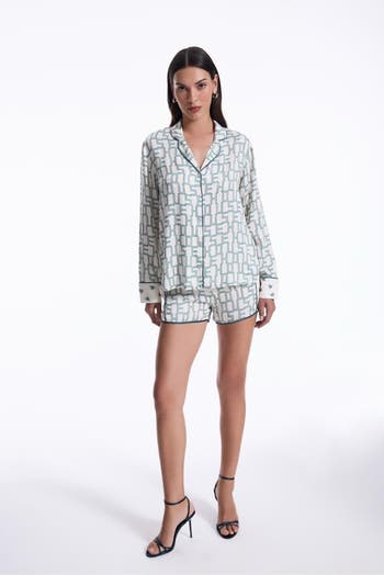 With contrast piping and glossy buttons, Honeybee brings subtle elegance to a timeless silhouette. The fully patterned fabric and relaxed shirt-and-short design turn your at-home moments into something effortlessly stylish. The model is wearing size Small.Model Measurements: Height 5'11" - Bust 31 in - Waist 24 in - Hips 35 in.