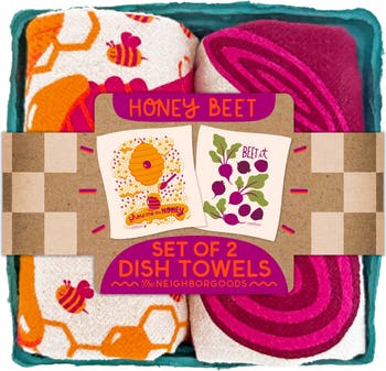 Brighten your kitchen with our Honey Beet Towel Set, featuring two of our signature 100% cotton dish towels: Honey and Beet. Bundled in a gift-ready, biodegradable produce container and topped with our sleek NEW branded belly band, this set is as cute as it is practical. Made from all natural, unbleached cotton and screen-printed with eco-friendly inks, these towels are soft, absorbent, machine washable, and gentle on the planet. They’ll add personality to any kitchen and bring you a smile. Perfect for holiday gifting, birthdays, housewarmings, and more! They also make adorable (and sustainable) gift wrap too
