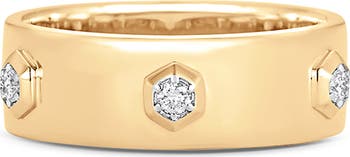 Dainty round diamonds sparkle from the raised honeycombs of a highly polished band crafted from warm 18-karat gold.