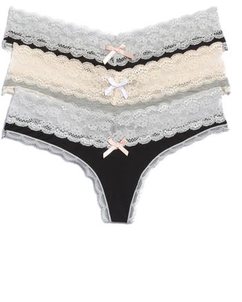 Indulge in ultrasoft, low-rise hipster thongs trimmed with scalloped lace.