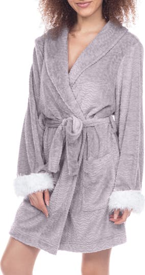 Look foward to cozy mornings in this plush, textured robe framed with faux-shearling cuffs.
