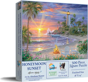Experience the tranquility of a honeymoon sunset with the SUNSOUT INC Honeymoon Sunset 500 Piece Jigsaw Puzzle for adults. This captivating puzzle, featuring the vibrant artistry of Abraham Hunter, expresses the peaceful beauty of the setting sun, calm waves, and a glowing lighthouse in a stunning 18" x 24" scene. This sustainably crafted puzzle is made from high-quality recycled cardboard and printed with soy-based inks, reflecting the commitment to preserve nature while providing endless entertainment. Proudly made in the USA, the puzzle showcases SunsOut's dedication to quality and care in its robust construction and interlocking pieces that fit seamlessly together for an enjoyable puzzle assembly experience. SunsOut values its customers by providing excellent service in resolving issues and offers a worry-free guarantee for missing or damaged pieces. Engage in an artistic escape and let your imagination wander through serene scenery as you assemble the Honeymoon Sunset puzzle, licensed by renowned artist Abraham Hunter. This puzzle is an artistic journey intended to captivate puzzle enthusiasts, transporting them to a world of beauty and tranquility.