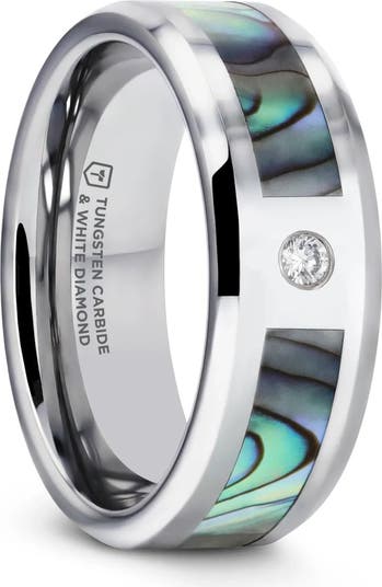 - Tungsten Carbide, Mother-of-Pearl inlay, 0.06 carat round cut white diamond with color I and clarity I1